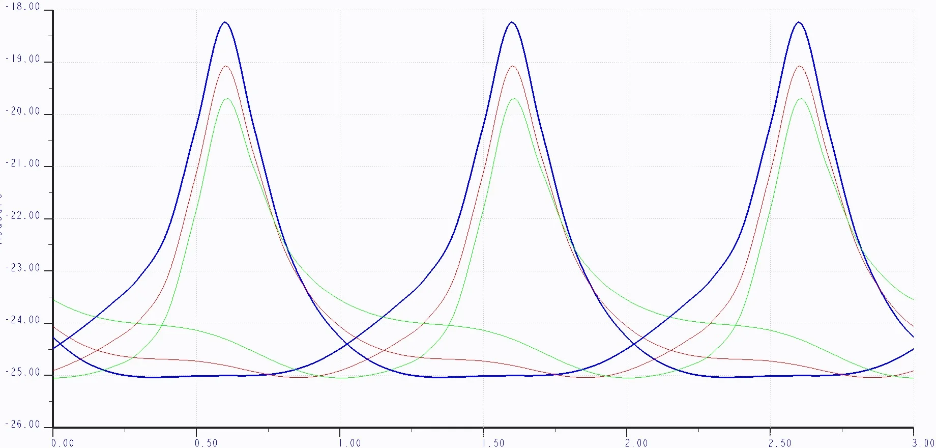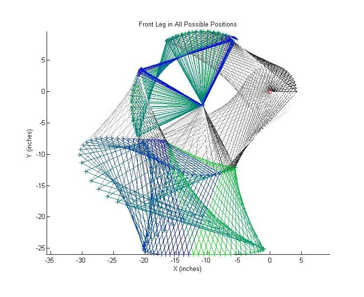 Vertical position of foot with addition of a foot to serve as a gait-smoothening cam. The blue lines represent the original gait, the red and green represent points on the cam. Look for the the lowest point of any of the lines as you look along the x-axis -- there is almost no fluctuation in Y-direction after the addition of the red and green lines (the cam). Thus the gait has been smoothened.