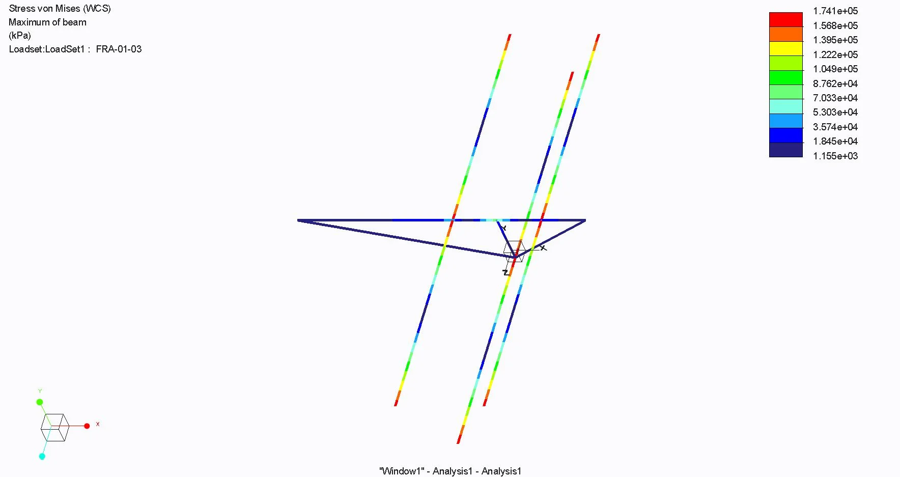 Forces on each joint in one leg. Note that the maximum force experienced is 180 lbf. This is with loading scenario with a factor of safety of 2.5